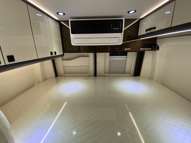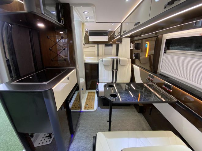 车内深色家具搭配暖黄白灯光,商务奢华氛围浓厚。布局合理,前驾驶室视野好;中部会客区四人对坐式卡座带可拆卸桌移至户外使用,会客厅可秒变床铺,上方多格储物柜方便收纳;厨房区带盖一体水盆、电磁炉、可拓展板、66L 冰箱一应俱全;尾部休息区固定大横床宽敞舒适,上方变频 KME 空调,四季如春。独立卷帘门式卫生间,设施完备,使用体验佳。