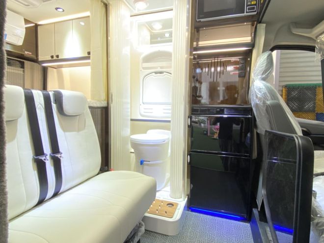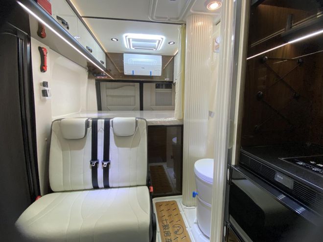 车内设施齐全,室内厨房配备微波炉、电磁炉、抽油烟机、电冰箱,满足简餐需求,橱柜收纳力强;室外厨房更是点睛之笔,抽拉的柴油炉、天气好时,在这烹饪美食,拥抱自然,还贴心配备折叠餐桌、户外电源、淋浴花洒。更绝的是,车内巧妙设计出 “顶天立地” 大衣柜,自带高清化妆镜,必要时可变身卫生间,干湿分离,方便又私密。